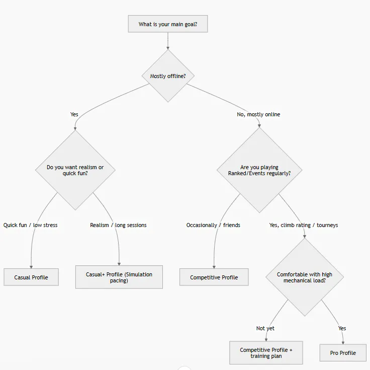 Trade-offs: Casual can build habits that don't translate; Simulation variance can feel “unfair” if you want strict input reward; Competitive is less forgiving.