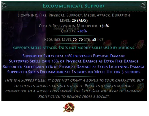 PoE 3.28: Added a new Strength/Intelligence Support Gem, Excommunicate: Supports melee attacks, causing them to gain a percentage of physical damage as extra fire and lightning damage, and excommunicate enemies on melee hit. Does not modify skills used by minions.