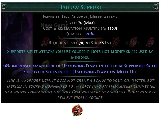 PoE 3.28: Added a new Strength/Intelligence Support Gem, Hallow: Supports melee attacks you use yourself, causing them to inflict Hallowing Flame on melee hit. Does not modify skills used by minions.