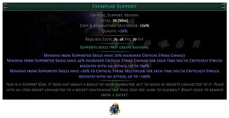 PoE 3.28 added a new Intelligence Support Gem, Exemplar Support: Supports Minion skills, causing your minions to have increased Critical Strike Chance and Critical Strike Multiplier for each of your own recent Critical Strikes.