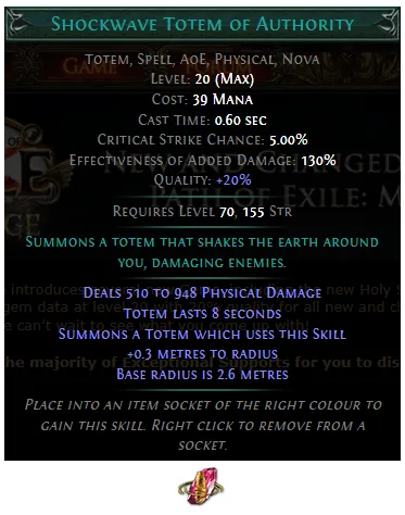 PoE 3.28: Added a new Strength Transfigured Skill Gem, Shockwave Totem of Authority: Summons a totem that shakes the earth around you, damaging enemies.