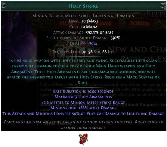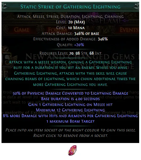 PoE 3.28: Added a new Strength/Intelligence Transfigured Skill Gem, Static Strike of Gathering Lightning: Attack with a melee weapon, gaining a Gathering Lightning buff for a duration if you hit an enemy. While you have Gathering Lightning, attacks with this skill will cause chaining beams of lightning, which chain farther the more Gathering Lightning you have.
