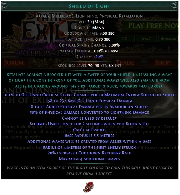 PoE 3.28: Added a new Strength/Intelligence Skill Gem, Shield of Light: Retaliate against a blocked hit with a sweep of your Shield, unleashing a wave of light in a cone in front of you. Additional waves also emanate from allies in a radius around the first target struck, towards that target.