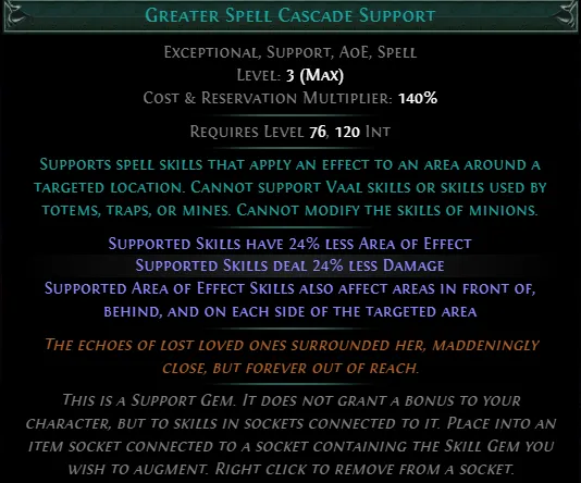 Flavour Text: Her understanding of the Atlas was not innate. The more committed she become to understanding it, the more the knowledge weighted on her. This is a Support Gem. It does not grant a bonus to your character, but to skills in sockets connected to it. Place into an item socket connected to a socket containing the Skill Gem you wish to augment. Right click to remove from a socket. | ![]() |