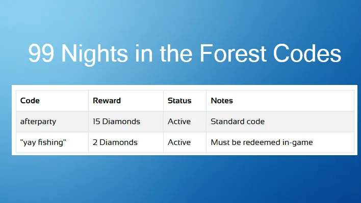 This guide lists all currently active and expired codes for 99 Nights in the Forest. Codes are a simple way to earn small in-game rewards like Diamonds or event currency. They are usually limited, so it's best to redeem them as soon as possible.