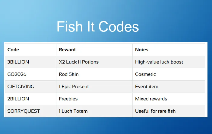 Fish It is a fishing-focused Roblox experience where progress depends heavily on luck, potions, bait, and upgrades. Redeemable codes are one of the easiest ways to get these resources without grinding. This article lists the currently active Fish It codes, explains what each reward does, and shows how to redeem them correctly.