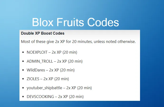 Blox Fruits is one of the most progression-heavy games on Roblox. Leveling, stat builds, and fruit grinding take time, so redeemable codes are an important support system. Most codes provide Double XP boosts or stat resets, which directly affect how efficiently you progress.