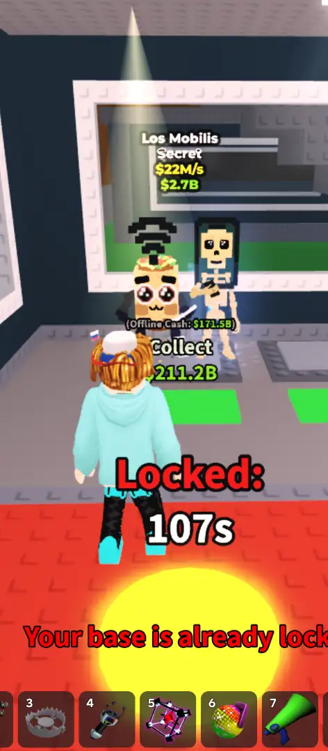 • Defense: To keep your collection safe, you can lock your base with laser gates or use defensive items like traps and the "Tung Bat" to fend off thieves.